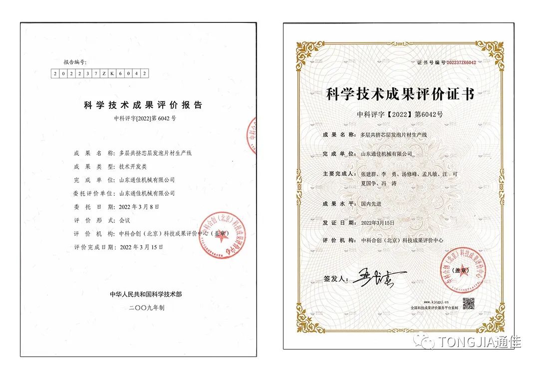 2022年4月27日,山东通佳技术研发中心再传捷报,基于生物降解材料的新装备多层共挤芯层发泡片材生产线通过经山东省科学技术厅组织专家鉴定,项目达到国内先进水平,并发放产品鉴定证书,鉴定号:202237ZK6042。经济宁市产品质量监督检验所检验,均达到设计要求,符合山东通佳机械有限公司Q/0800JTJ010-2022企业标准和国家有关标准,检验报告编号为No:(22)SW2002。